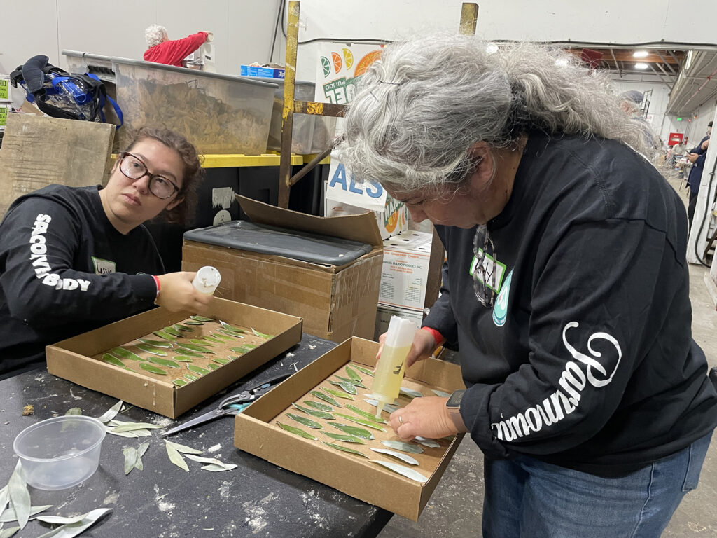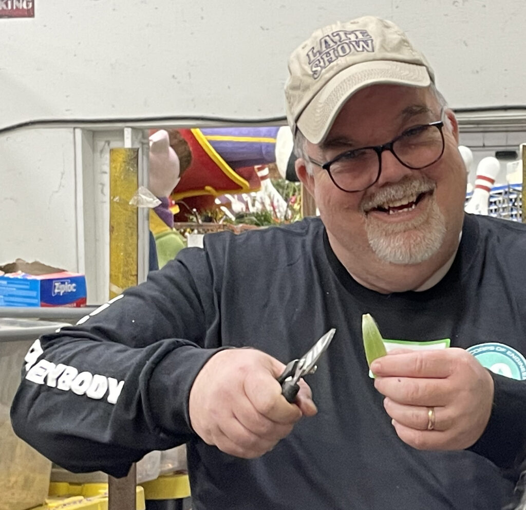 Joe Queen works on the leaves that will grace the captain’s chair on the “Star Trek” float. Joe is the USS Angeles member who organized the mission to decorate the Rose Parade float.