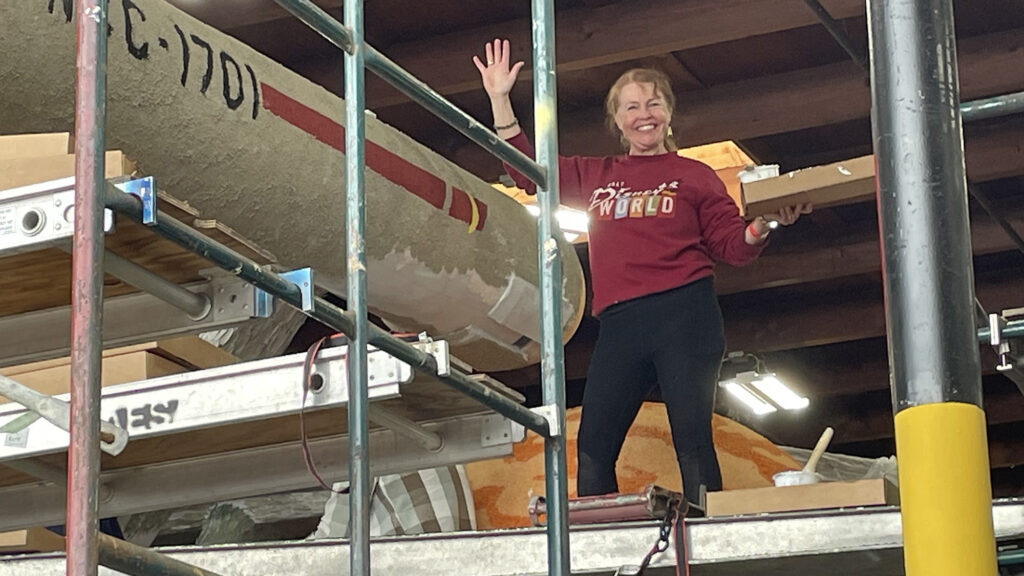 USS Angeles member Amanda Payatt stands at the top of the giant “Star Trek” float, where she worked near a nacelle of the USS Enterprise.